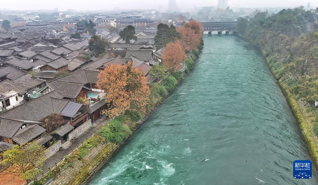 图为内江与西街(无人机照片,12月6日摄)。西街位于都江堰宝瓶口以南,与伏龙观隔江相望,是一条有着几百年历史的古街。