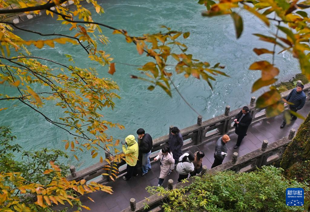12月6日,游客在都江堰景区内的堰功道游玩。为了纪念治水先贤,都江堰人修建了这条堰功道,两侧放置了十二尊青铜雕像,分别代表了各历史时期治水建堰的有功之臣。