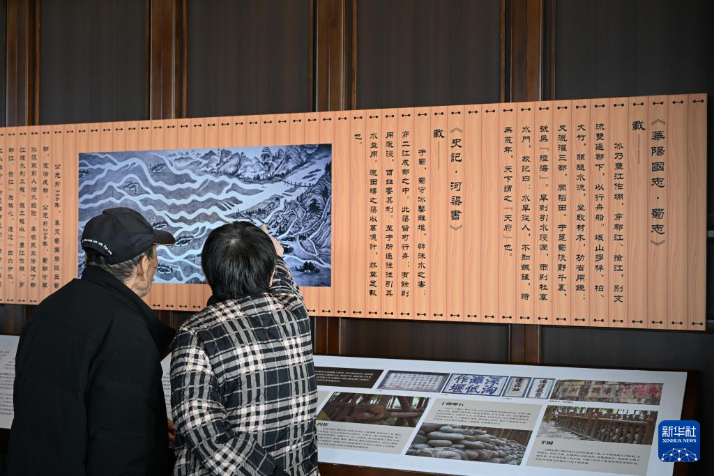 11月30日,游客在都江堰景区秦堰楼里了解都江堰水利工程。