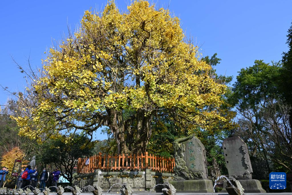 11月30日,游客在堰功道张松银杏下拍照。张松银杏距今已有1800多年的历史,传为三国名士西蜀别驾张松手植而故名。