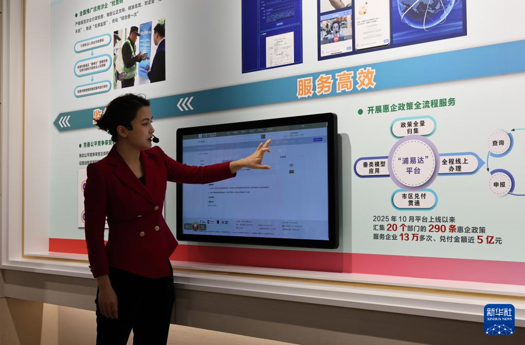 12月6日,讲解员在触控屏幕前为参观者介绍上海一网通办“浦易达”平台的功能。