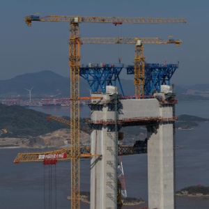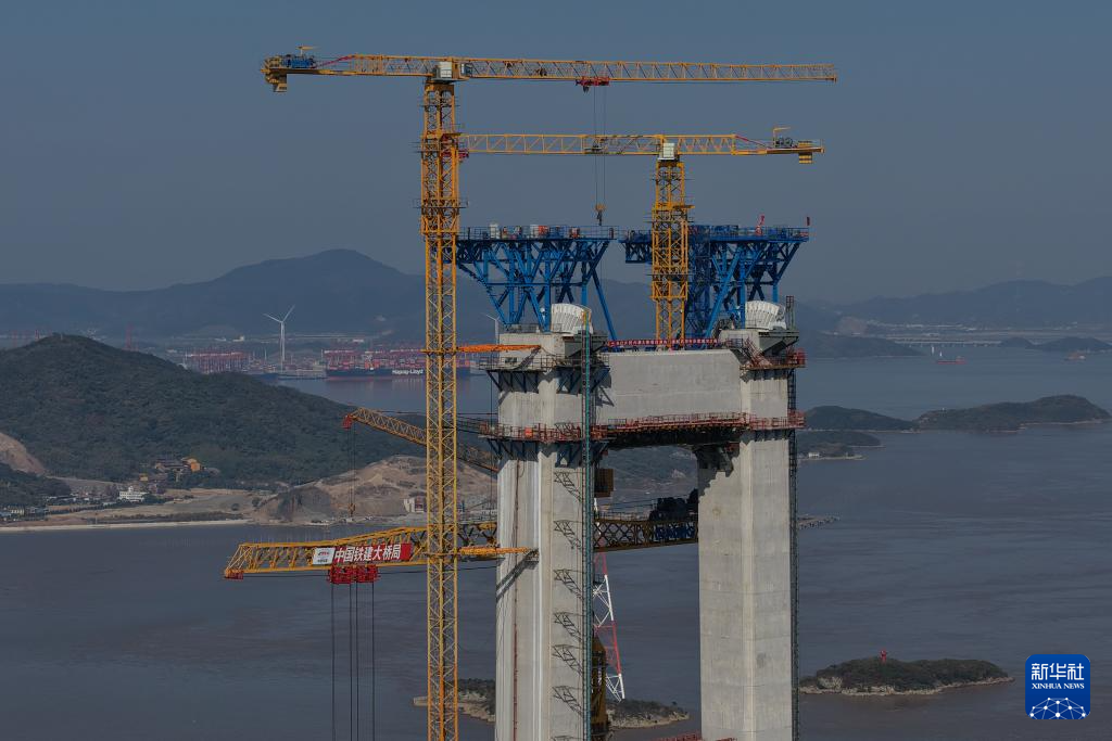 12月6日拍摄的双屿门特大桥六横侧索塔施工现场,远处为宁波舟山港梅山港区(无人机照片)。