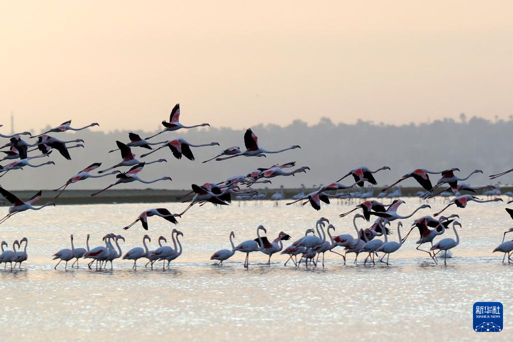 这是12月6日在埃及法尤姆省加龙湖拍摄的火烈鸟。