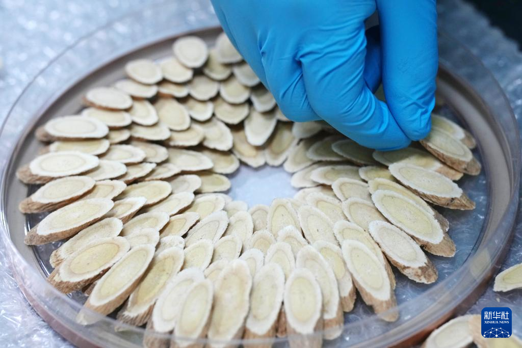 工作人员在宁夏固原市隆德县一家药材加工企业包装黄芪(12月6日摄)。