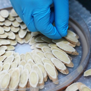 工作人员在宁夏固原市隆德县一家药材加工企业分拣黄芪(12月6日摄)。