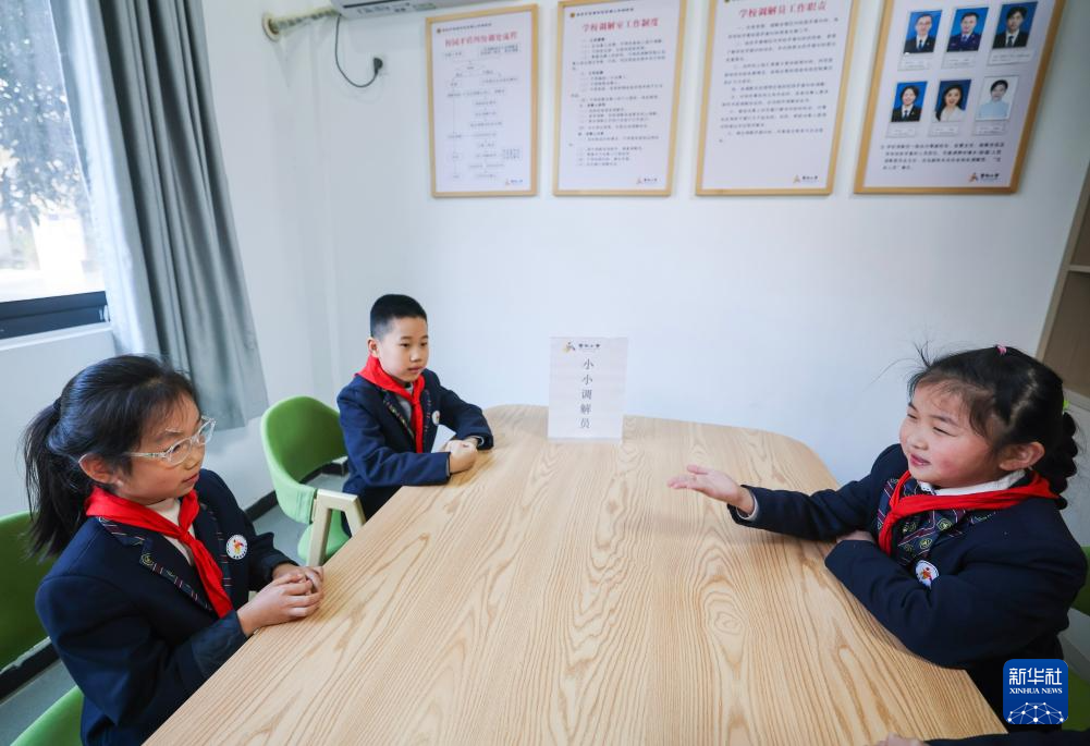 12月9日,在暨南街道中心学校暨南小学的矛盾调解室,学生调解员(右一)在调解同学间的小矛盾、小纠纷,这也是学校培养学生法治意识和调解能力的方式之一。