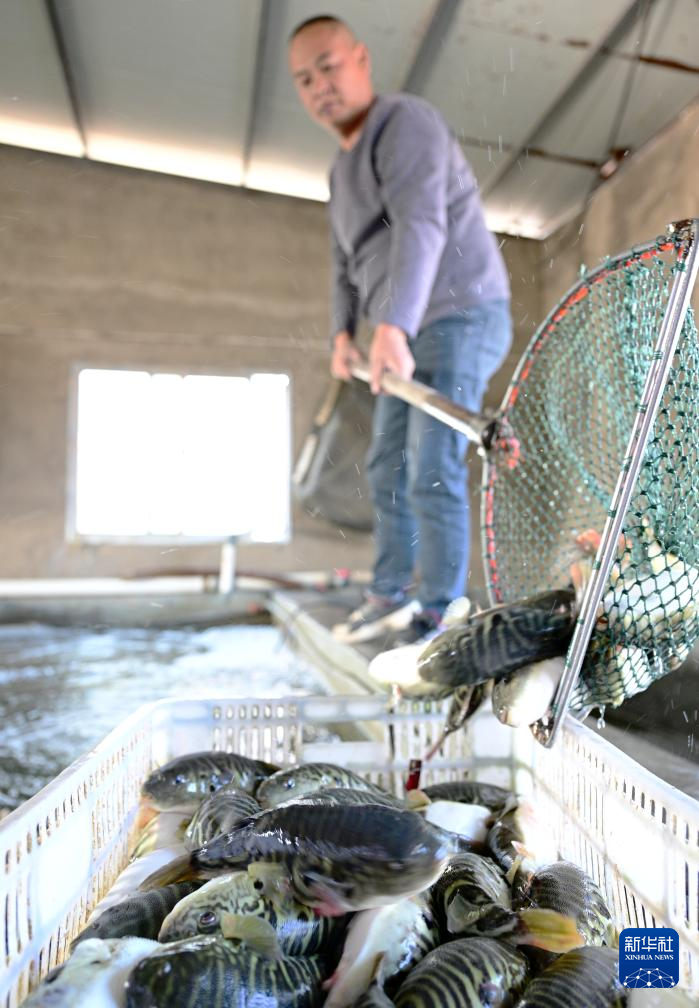 12月10日,东坂村河豚养殖户在给河豚投喂食物。