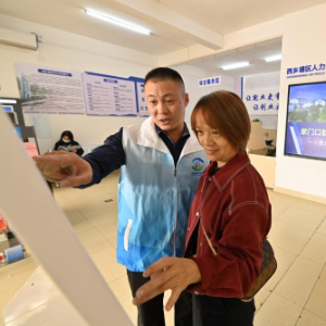 12月10日,在广西南宁市西乡塘区零工市场,工作人员(左)指导市民查找就业招聘信息。