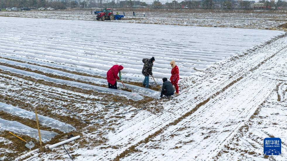 12月12日,河南省商丘市睢县董店街道皇台村农户冒雪为种植的蔬菜幼苗覆盖保温薄膜(无人机照片)。