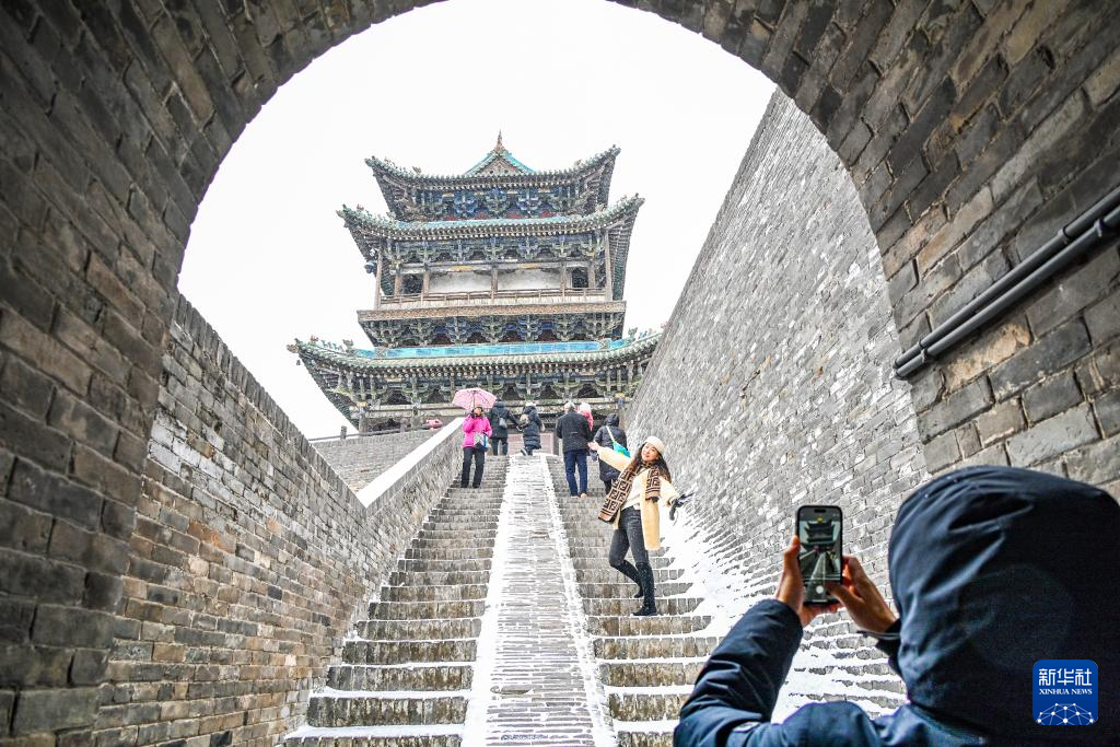 12月12日,游客冒雪在位于山西省晋中市的平遥古城游览观光。