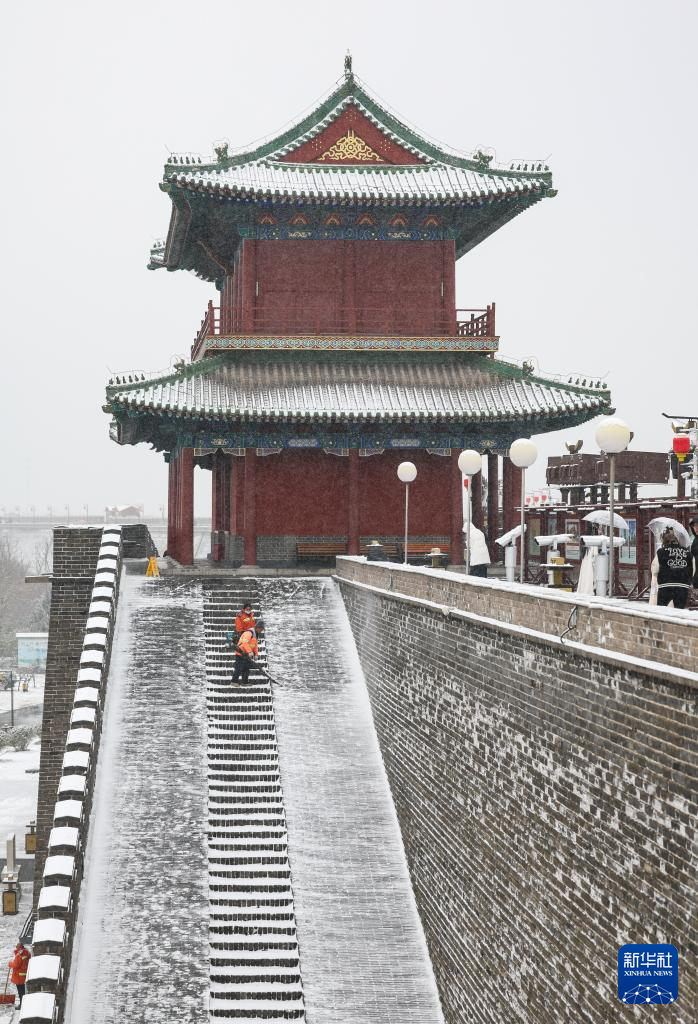 12月12日,环卫工人在河北省石家庄市正定古城南城门清扫积雪。