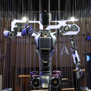 12月12日,参观者(左一)与工作人员在一组傲意灵巧能手展品前交流。