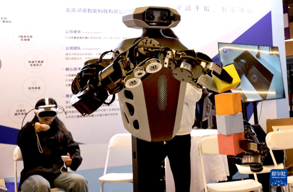 12月12日,工作人员(后)与机器人配合进行悬空搭积木演示。