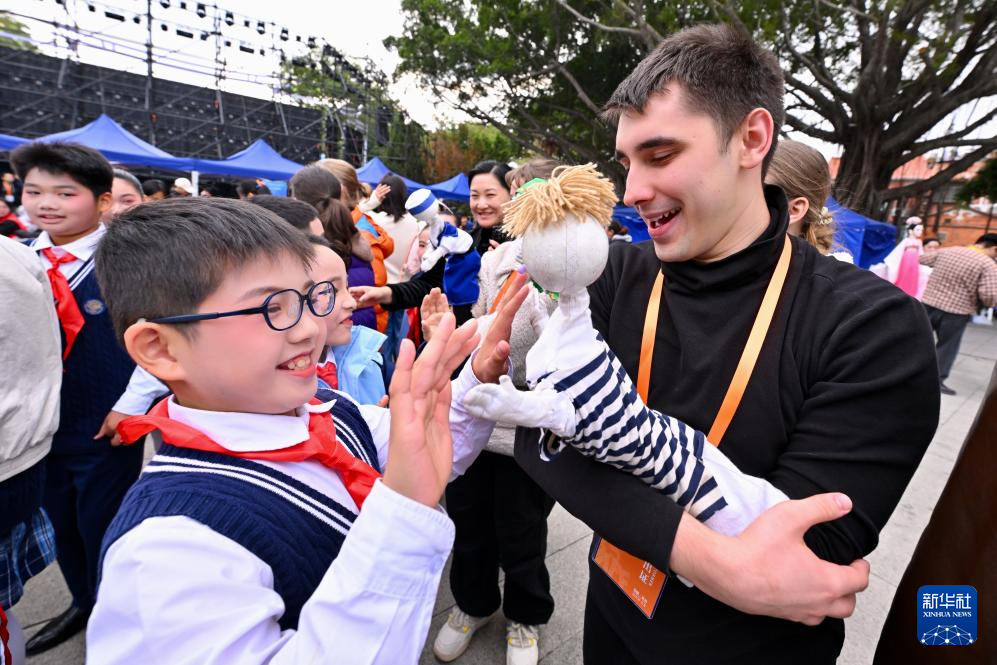 12月12日,参加泉州国际木偶展演活动的俄罗斯青年与小朋友互动。