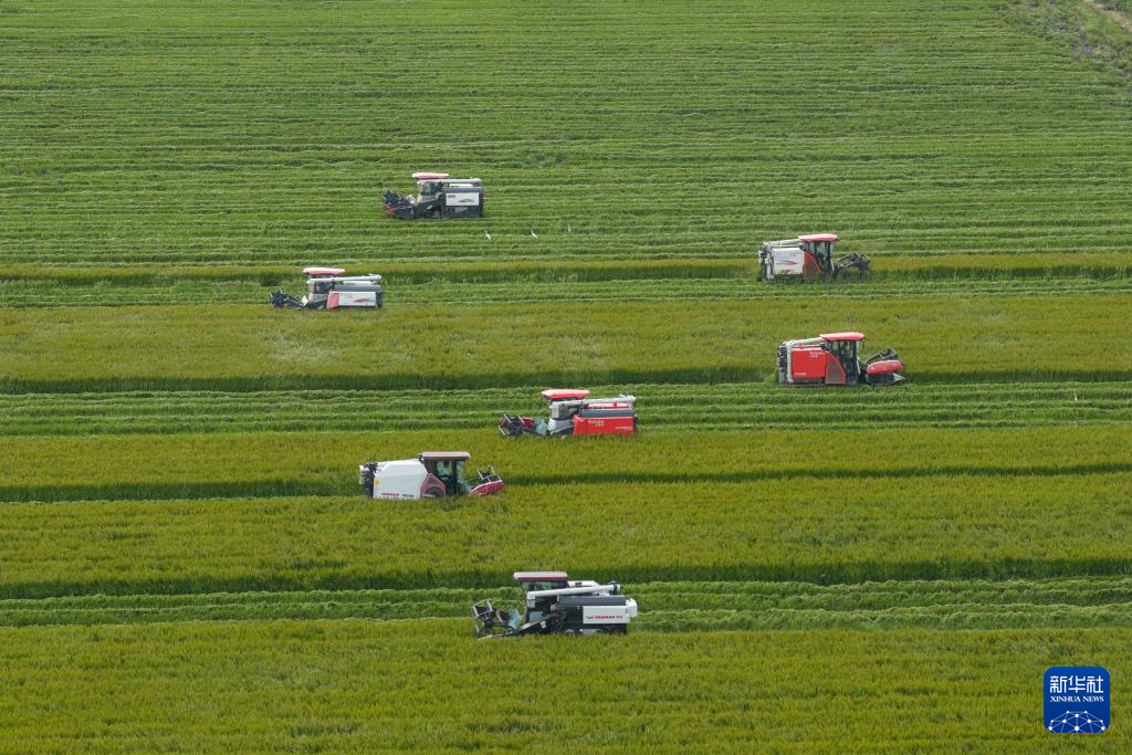 9月23日,收割机在浙江省余姚市滨海现代农业产业先导区收割晚稻(无人机照片)。
