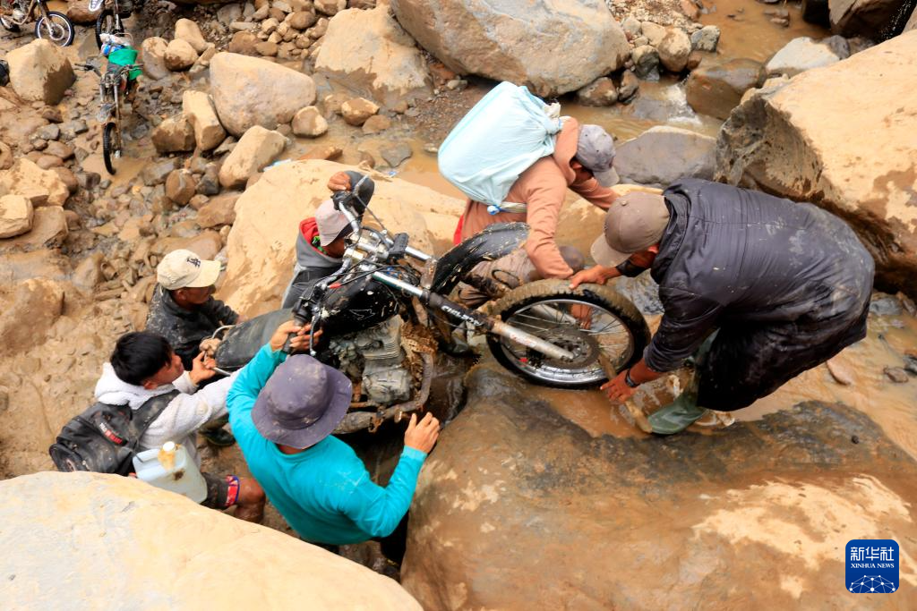 12月9日,在印度尼西亚亚齐省,人们带着摩托车过河。
