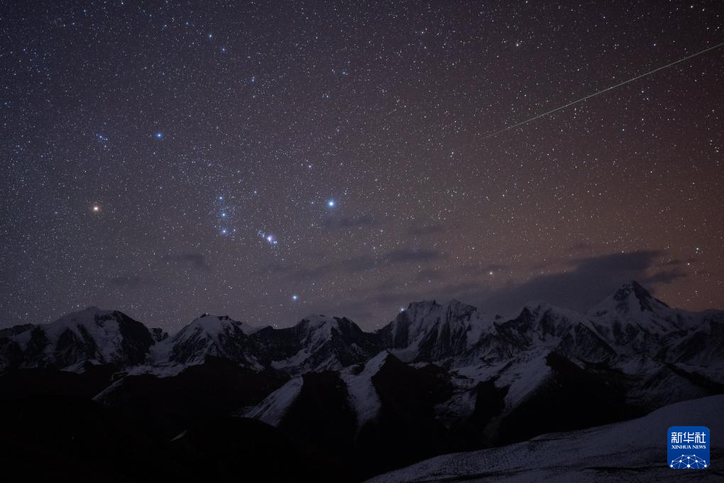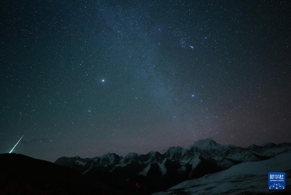 12月12日,在四川省康定市甲根坝镇提弄村,一颗双子座流星从雪山上空划过。