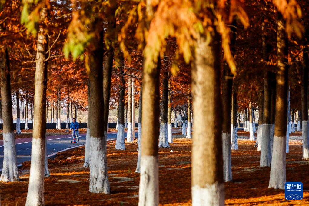 12月15日,游客在浙江省嘉兴市南湖区范蠡湖公园水杉林游玩。