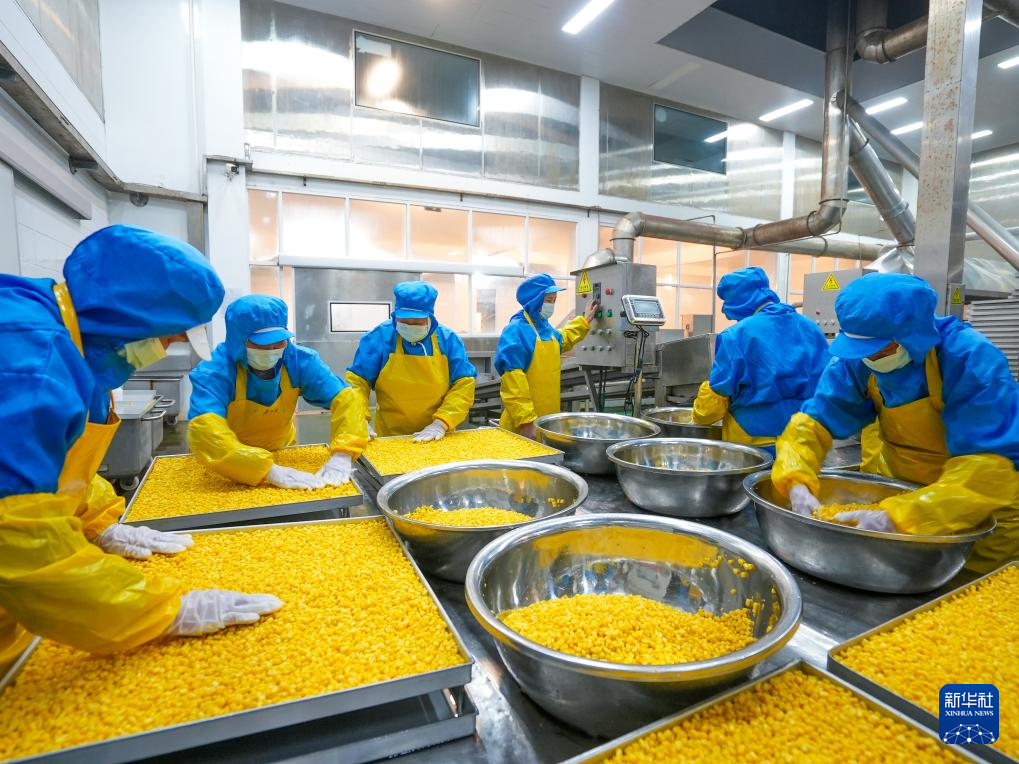 12月16日,工人在江苏省兴化市垛田街道顶能科技有限公司生产车间加工冻干玉米。