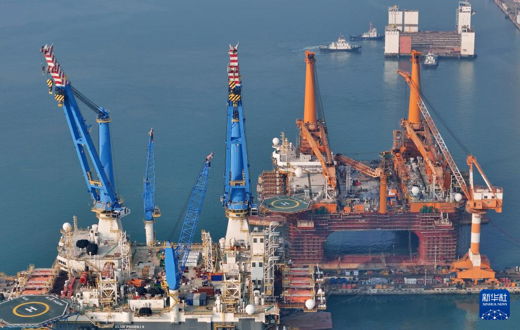 12月16日,在中集来福士山东烟台建造基地,多型海工装备在进行建造作业(无人机照片)。