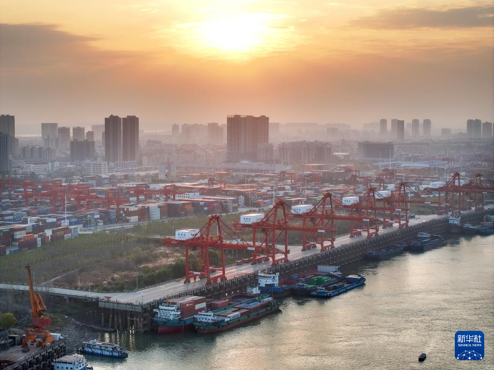 12月16日,轮船停泊在湖北省港口集团阳逻国际港集装箱码头进行装卸作业(无人机照片)。