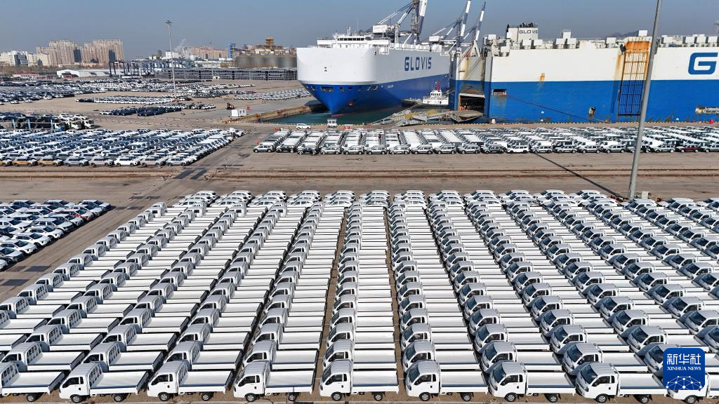 12月4日,汽车停在山东港口烟台港等待装船(无人机照片)。