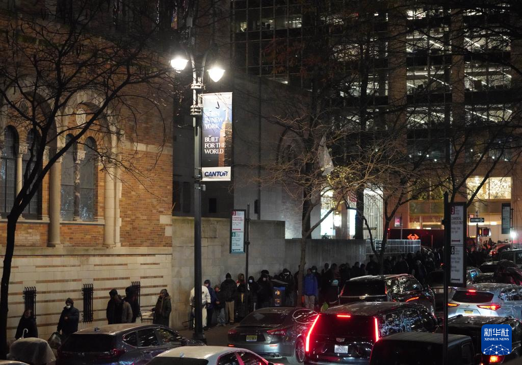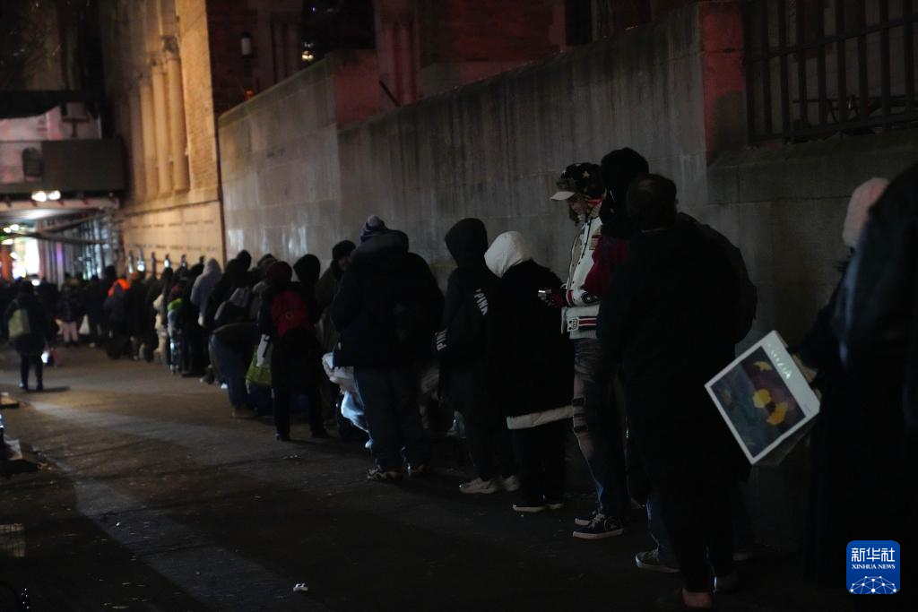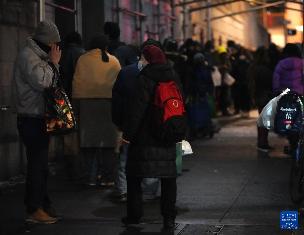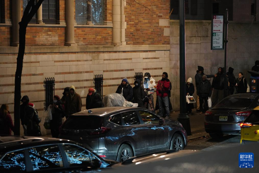 当日,数百名无家可归者和其他需要救助的人在美国纽约曼哈顿的一个救助点排起长队,在暮色中等待领取一份免费晚餐。