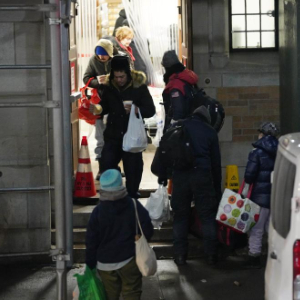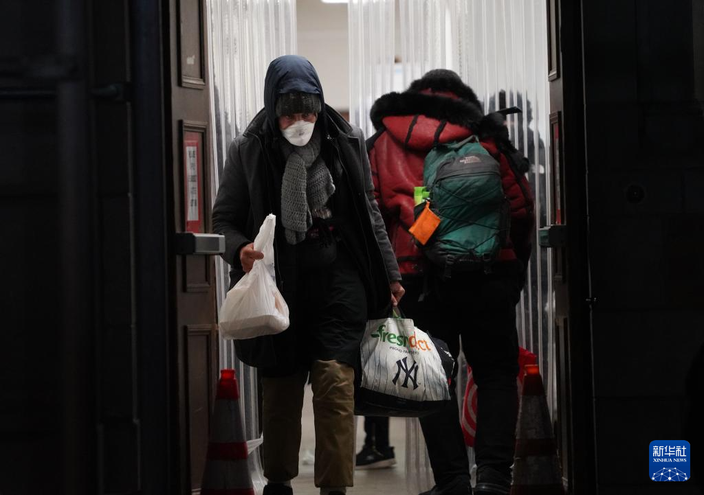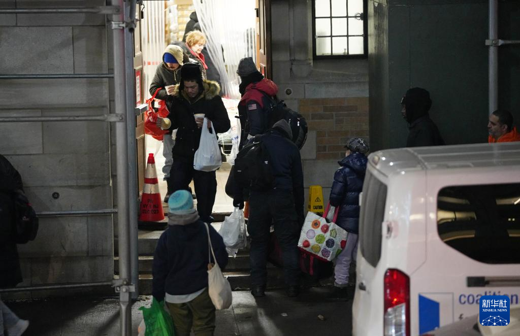 12月17日,在美国纽约曼哈顿,人们拿着免费晚餐走出救助点。