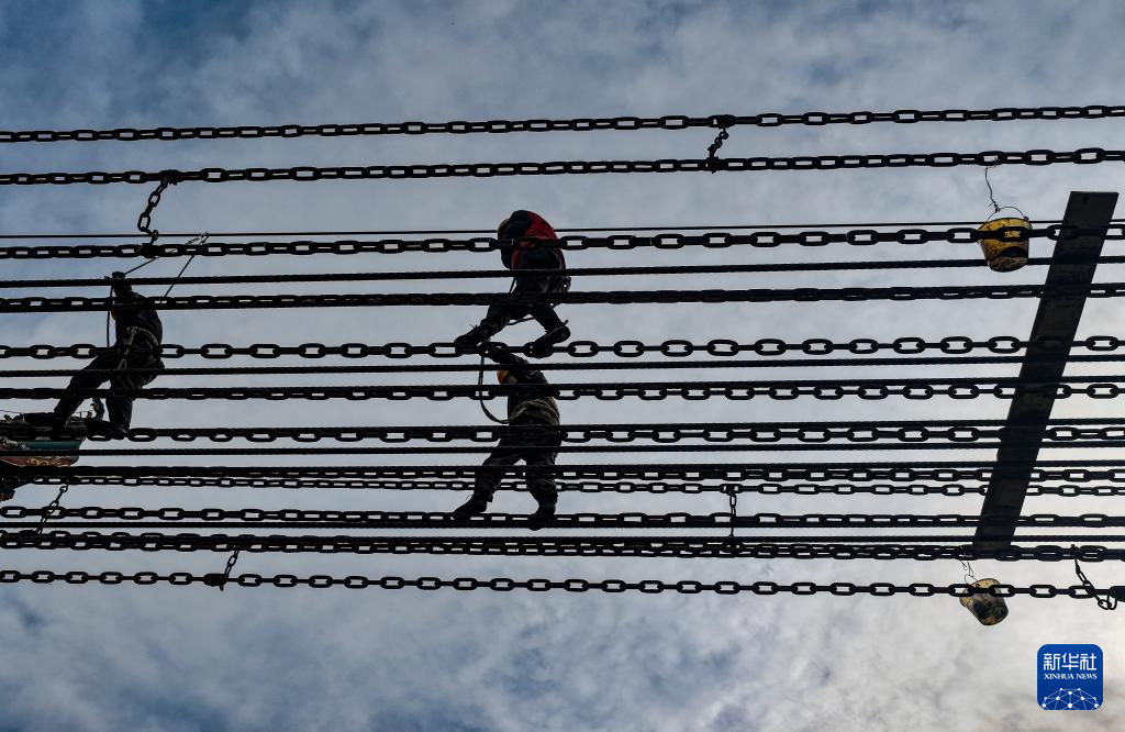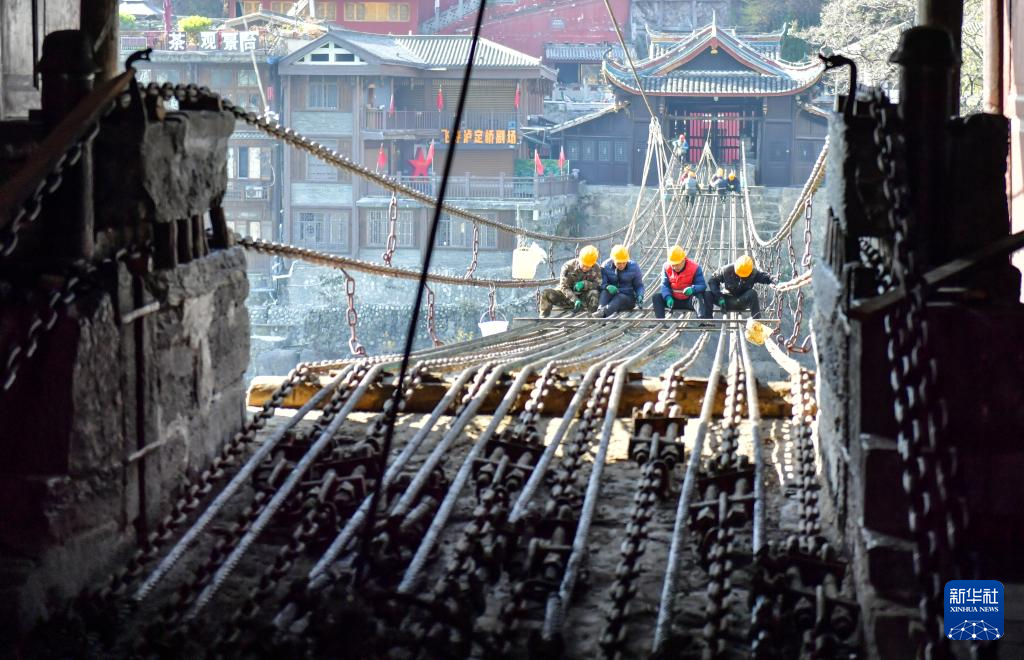 12月17日,工人对泸定桥进行检修维护(无人机照片)。