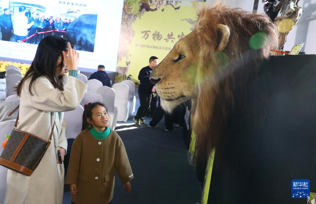 12月20日,参观者在作品展上展出的狮子标本前驻足观看。