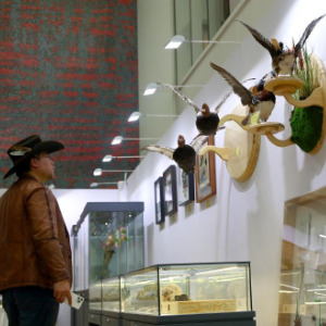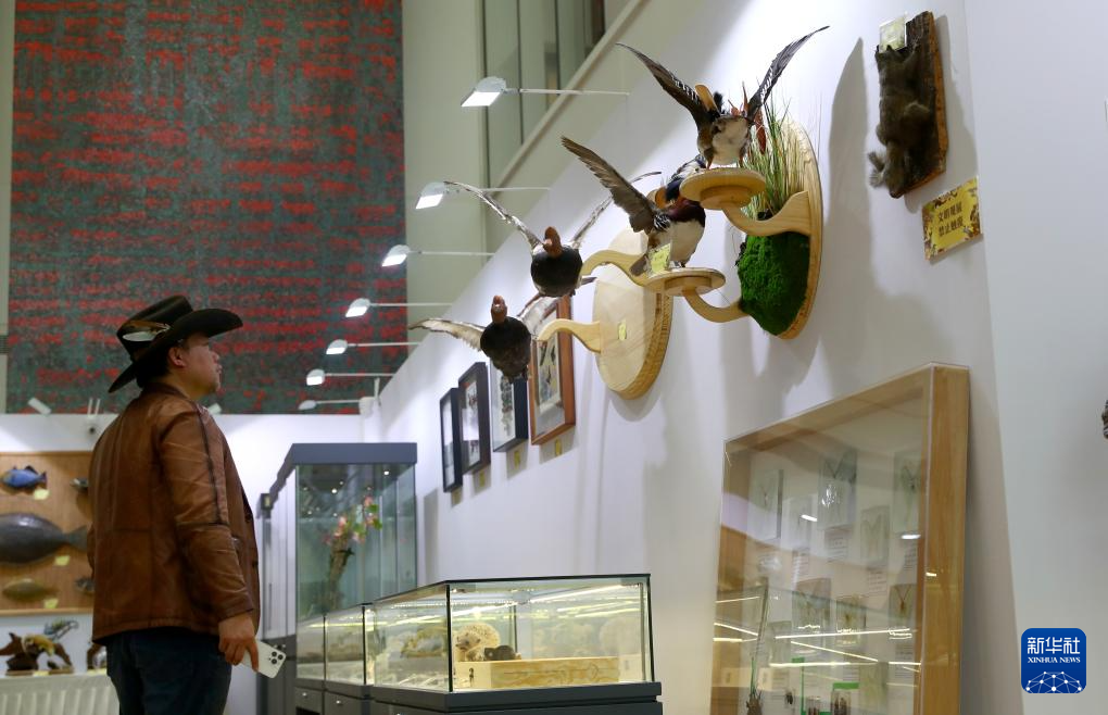 12月20日,参观者在一组鸟类标本前驻足观看。