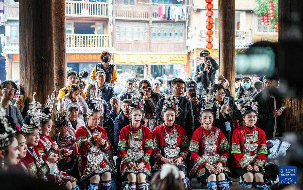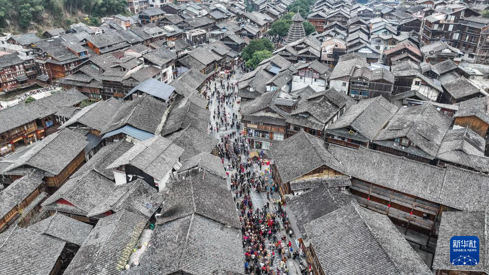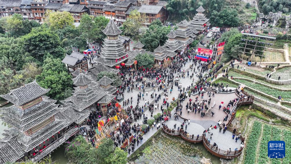 12月20日,游客与侗族群众在肇兴侗寨正门欢庆侗年(无人机照片)。