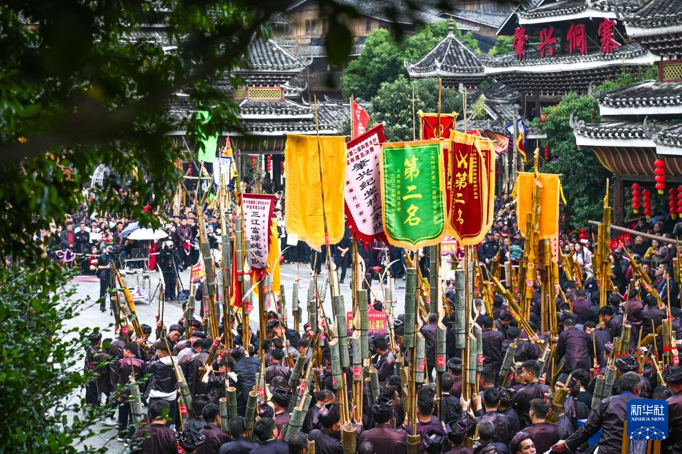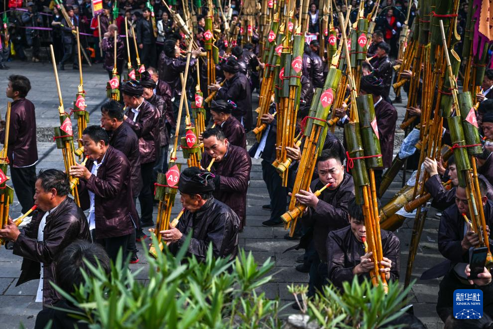 12月20日,在黎平县肇兴侗寨,侗族群众在赛芦笙。