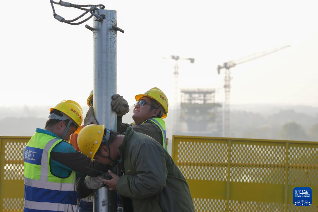 12月20日,中铁十六局建设者在通甬高铁嘉兴特大桥跨杭申线航道矮塔斜拉桥连续梁0号块浇筑施工现场作业。