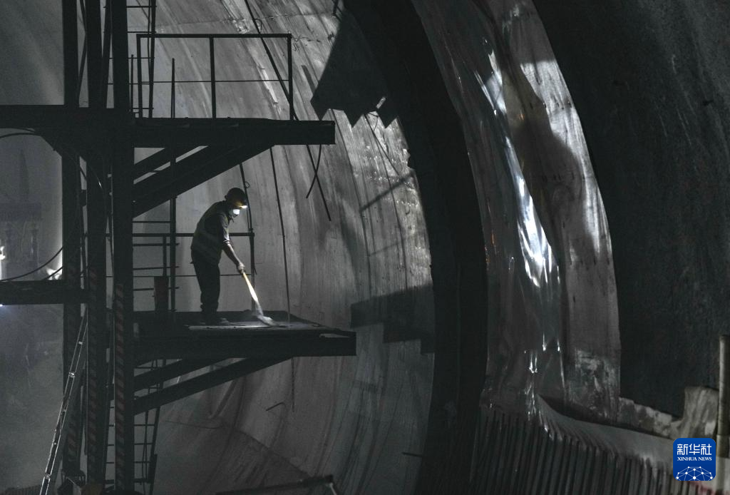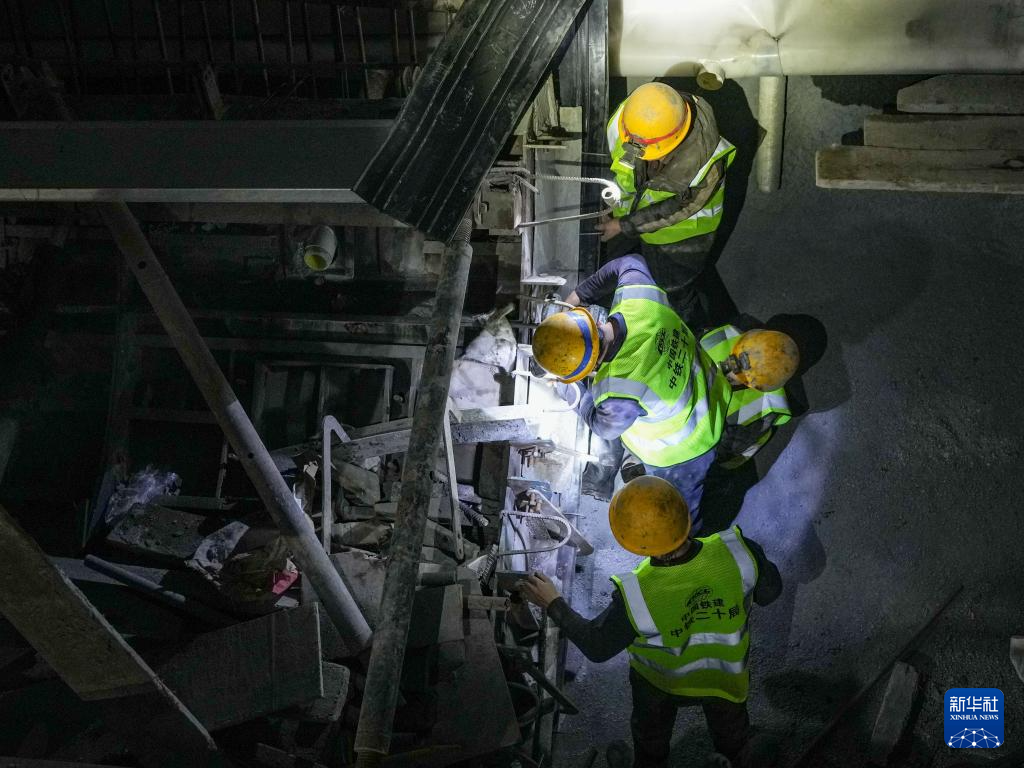 12月20日,工人在西渝高铁梨花村隧道内施工作业。