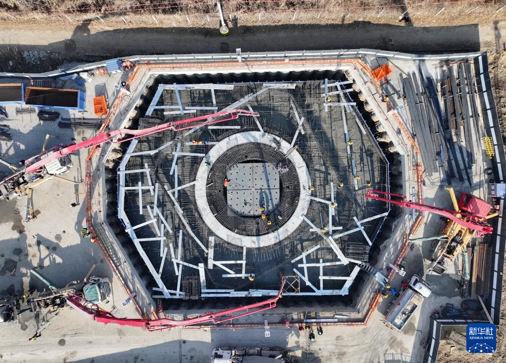 中铁十一局工人在石雄铁路跨朔黄铁路特大桥176号墩转体桥承台浇筑现场作业(12月23日摄,无人机照片)。