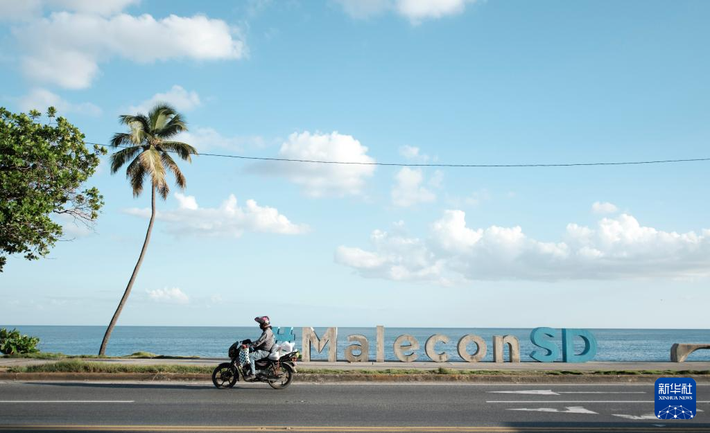 12月2日,在多米尼加圣多明各海边,市民骑摩托车经过海滨大道。