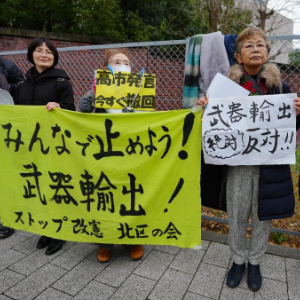 针对日本执政联盟自民党与日本维新会拟取消对武器出口的5种类型限制、为武器出口大幅“松绑”,日本民众25日下午在位于东京的自民党总部前举行抗议集会。