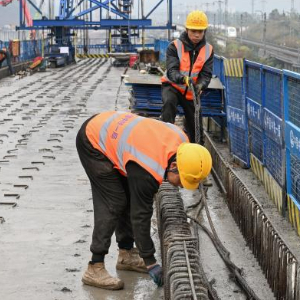12月25日,工人在渝万高铁打青沟左线大桥连续梁建设现场施工作业。