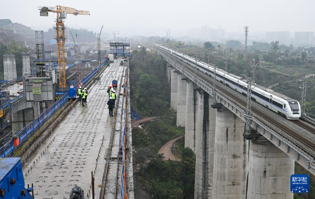 12月25日,列车驶过渝万高铁打青沟左线大桥连续梁建设现场。