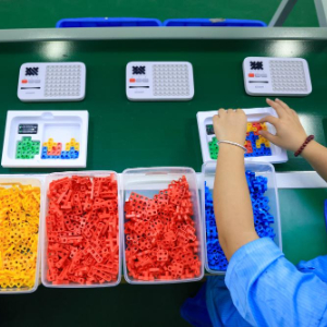 10月29日,在广东佛山顺德的计客玩具生产线,工人组装超级积木。