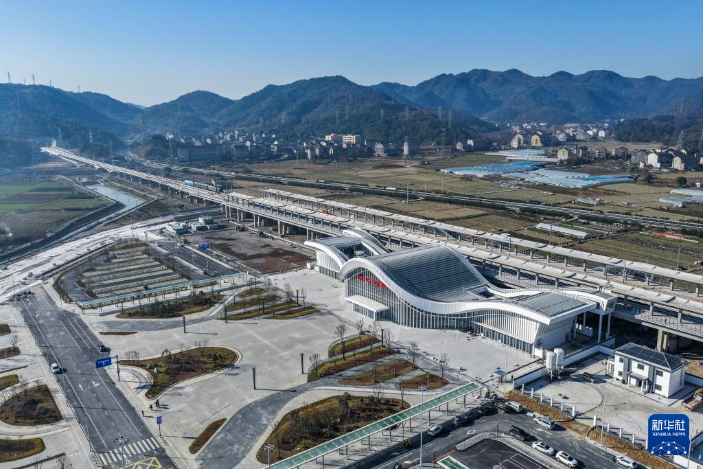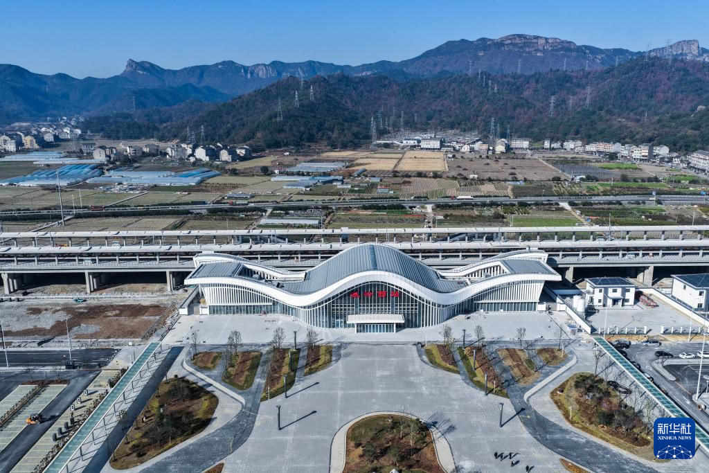 12月28日,空中俯瞰温岭西站,经过该站的正线钢轨已经铺设完成(无人机照片)。