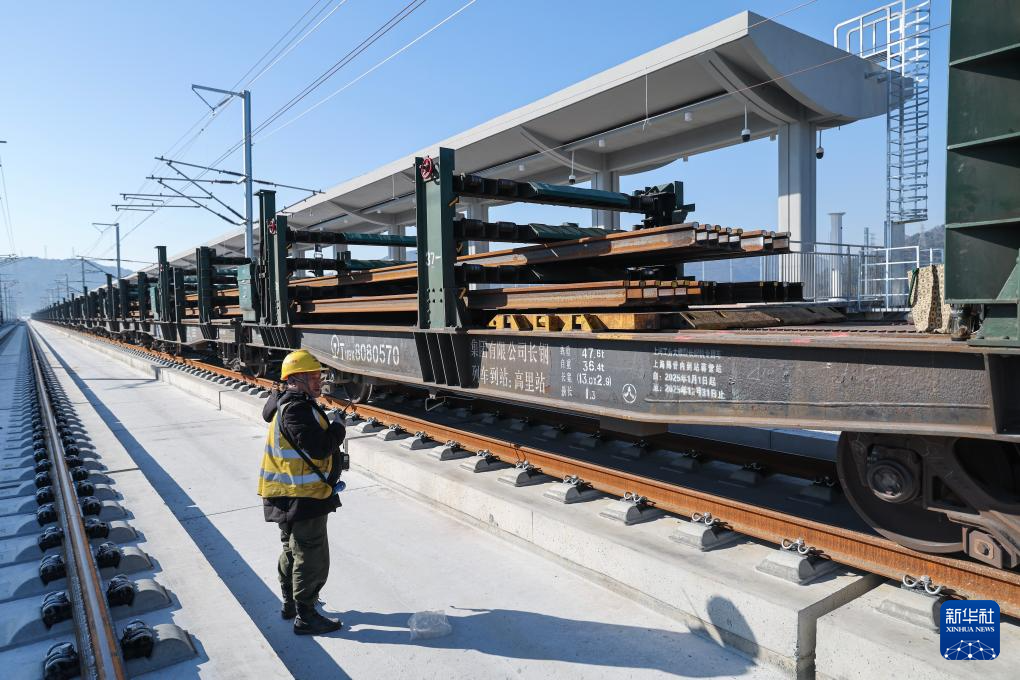 12月28日,中铁十四局工作人员引导长钢轨运输车驶离温岭西站。