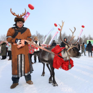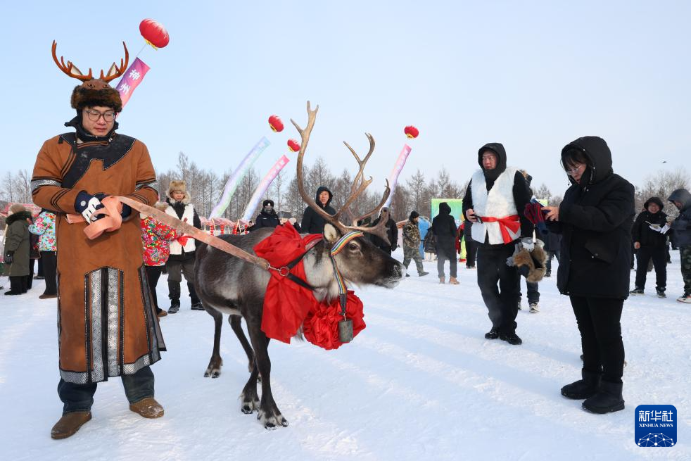 12月30日,游人在冬捕活动现场与驯鹿近距离互动。