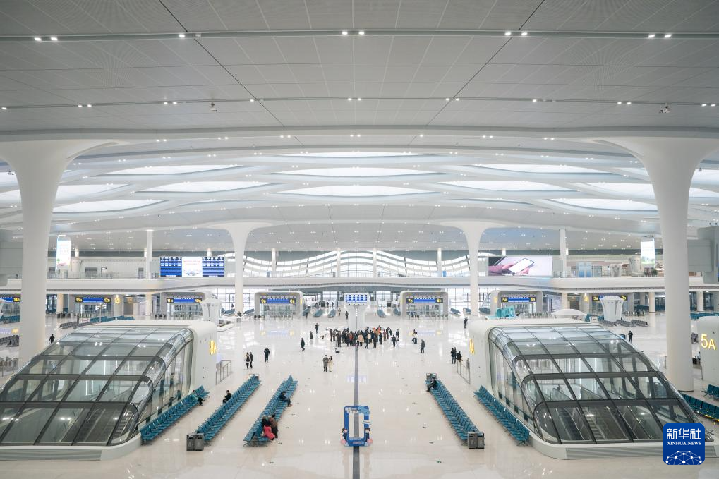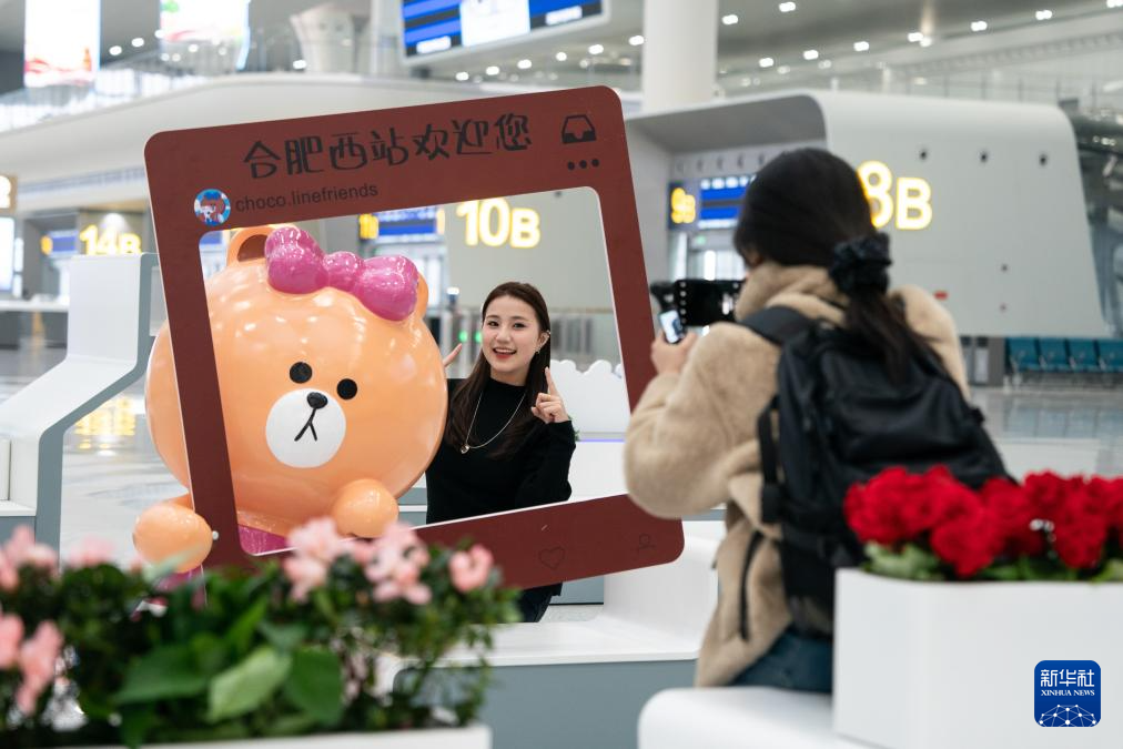 12月30日,旅客在合肥西站候车大厅打卡留念。