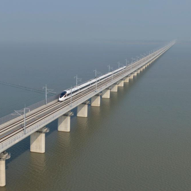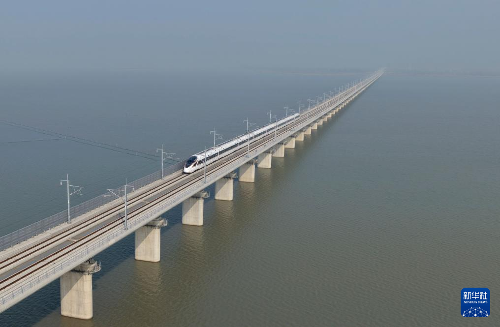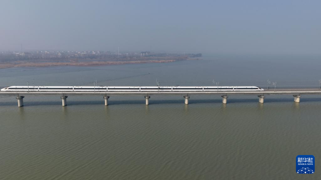 12月30日,列车驶过合新高铁怀洪新河特大桥(无人机照片)。