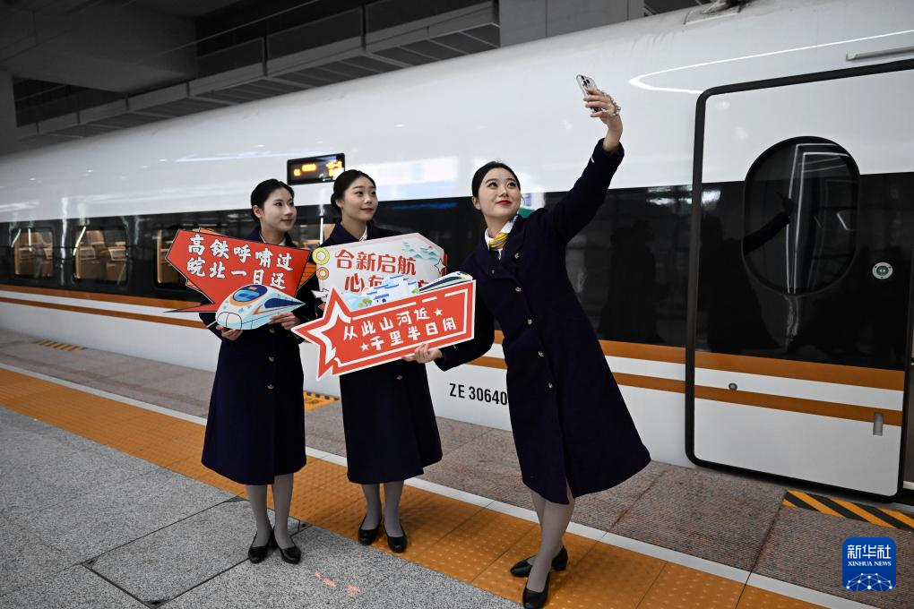 12月30日,在合肥西站,旅客和合肥客运段乘务员在首发列车G9500次列车前合影留念。