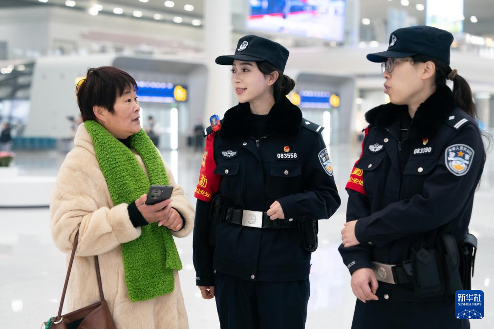 12月30日,旅客在合肥西站候车大厅向民警咨询问题。