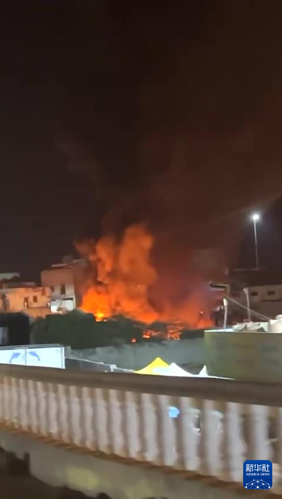 这张视频截图显示,12月30日,在也门哈德拉毛省穆卡拉港,空袭引起大火。