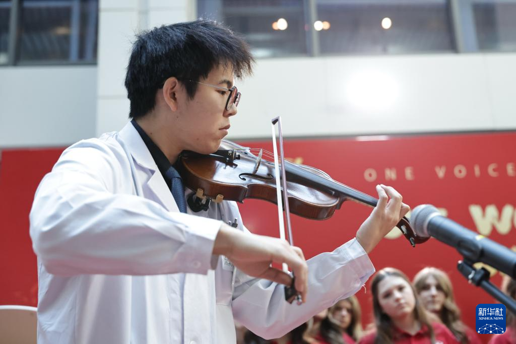 12月31日,北京协和医院协韵演奏团小提琴手欧阳泉石在北京协和医院门诊楼主街上表演。